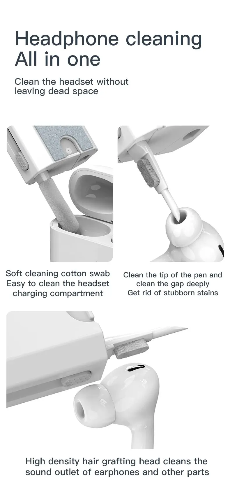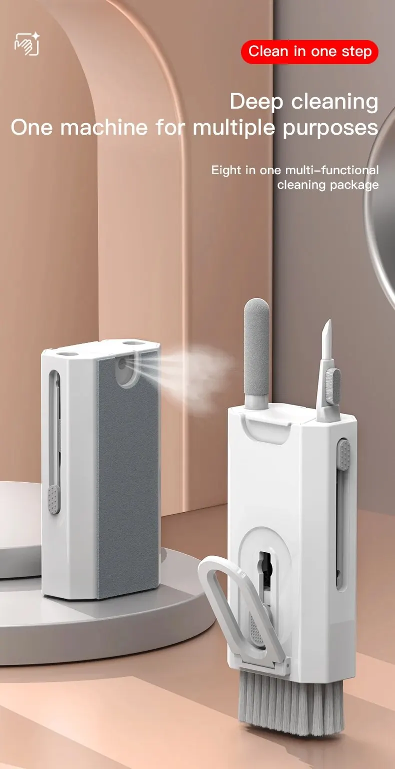 Ein multifunktionales tragbares Reinigungsset, das das Ladefach von Bluetooth-Kopfhörern reinigen, die Tonauslass der Kopfhörer reinigen und auch als Telefonständer verwendet werden kann.Es kann die Tastatur reinigen, den Bildschirm abwischen und verfügt über einen praktischen Tastenextraktor zum Reinigen.